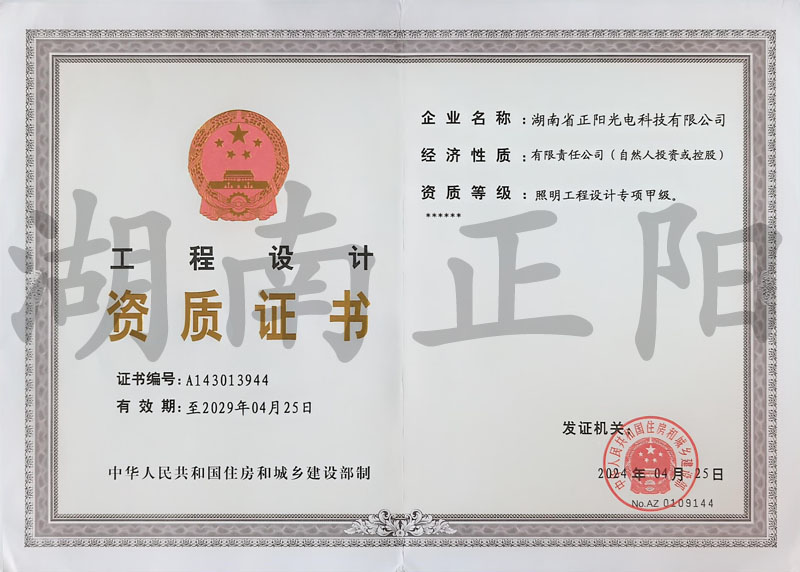 湖南省正陽光電科技有限公司是一家從事亮化工程及大型燈光藝術的設計、制作、安裝和維護于一體的專業化公司。公司資質齊全、管理嚴謹、技術先進、實力雄厚,取得了城市及道路照明工程專業承包壹級資質、照明工程設計專項甲級資質、機電工程施工總承包貳級資質、施工勞務等資質、國家高新技術企業、國家“重質量·守誠信”示范企業。
